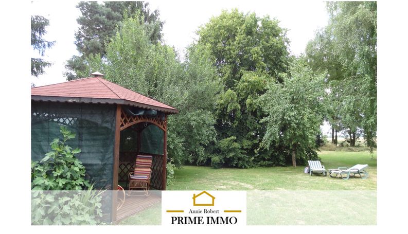 Maison de près de 104 m2 sur un beau terrain plat de 4700 m2, avec des arbres fruitiers et différents espaces de repos aménagés.