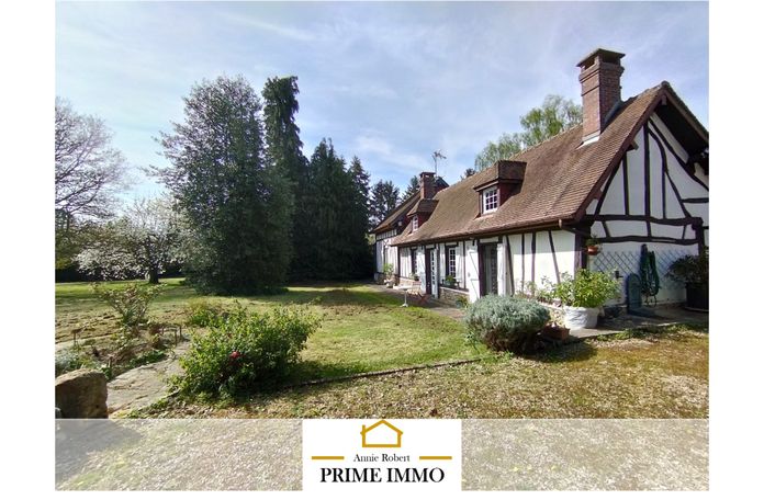 Maison à colombages avec un salon séjour ouvert sur le jardin et 2 chambres dont une à l 'étage.